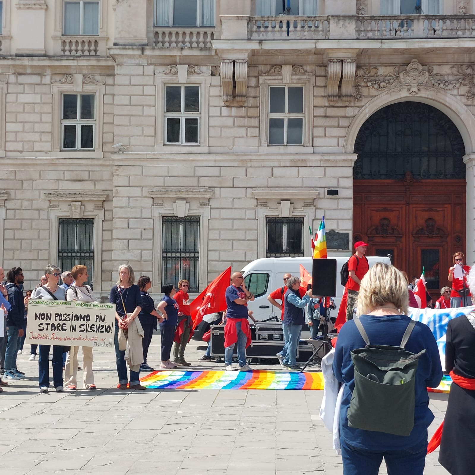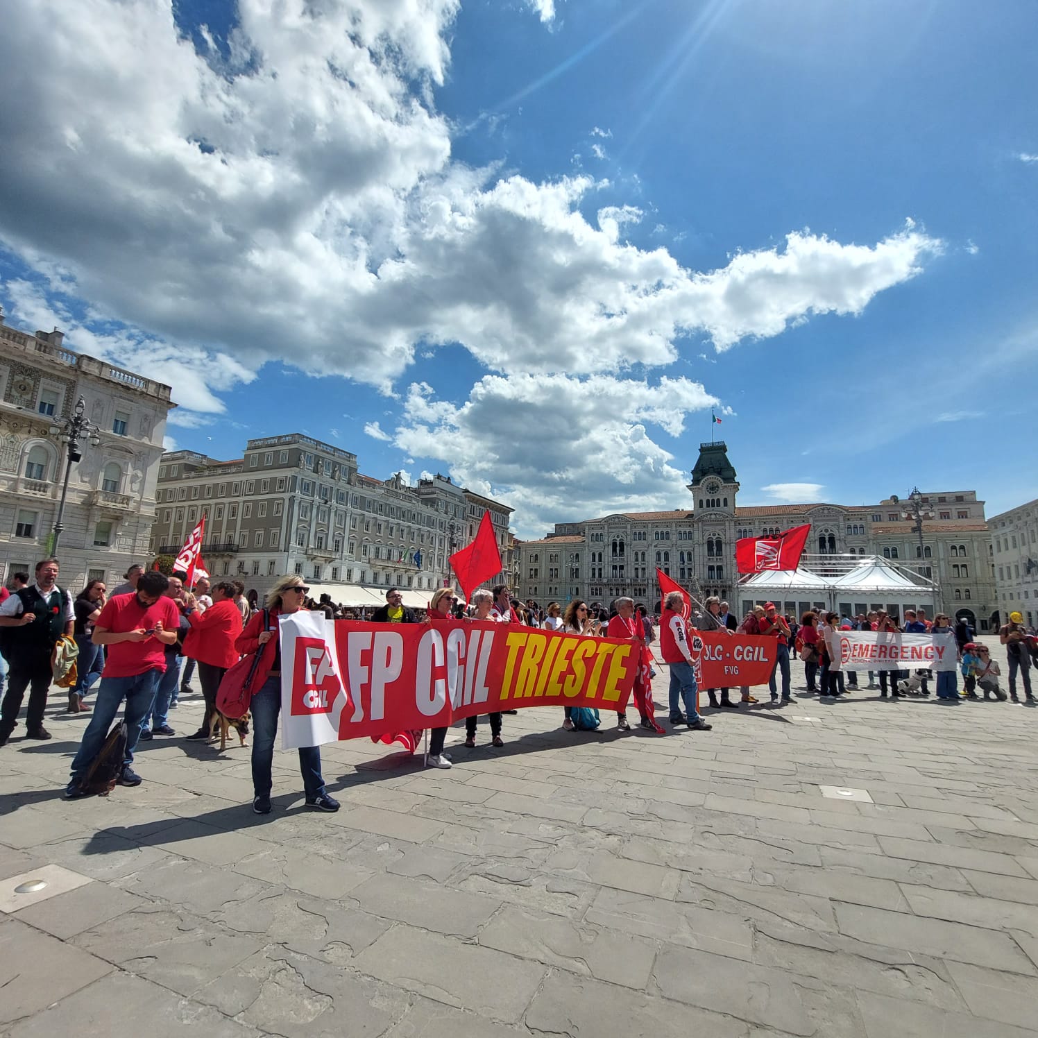 Il corteo era aperto dalla bandiera storica di Cgil Trieste, affiancata dalla presenza del Segretario Generale Marega.