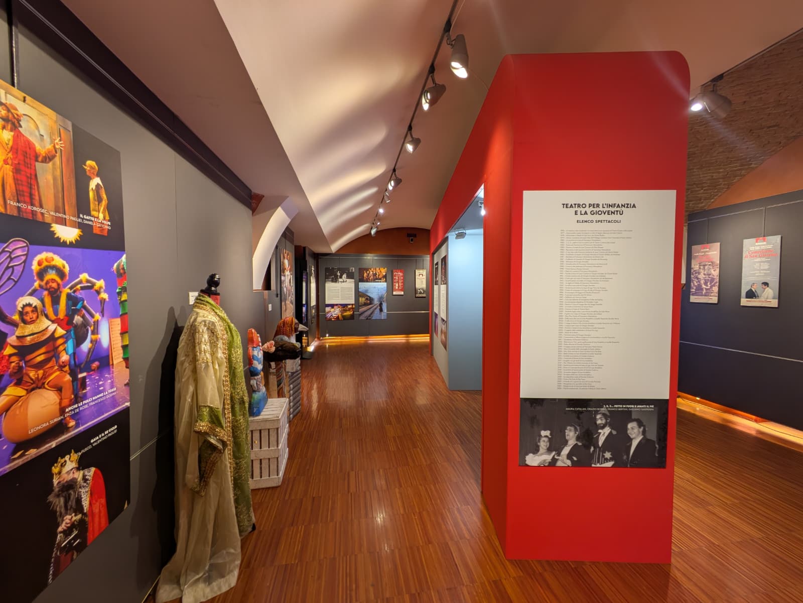 Il percorso espositivo si snoda infatti attraverso sezioni tematiche che guidano il visitatore dalle origini orientate orgogliosamente al teatro ragazzi, in quell’epoca fucina di sperimentazione, fino alle fortunate produzioni in dialetto triestino che hanno segnato un’epoca, come A casa tra un pocoMarcovaldoDue paia di calze di seta di Vienna.