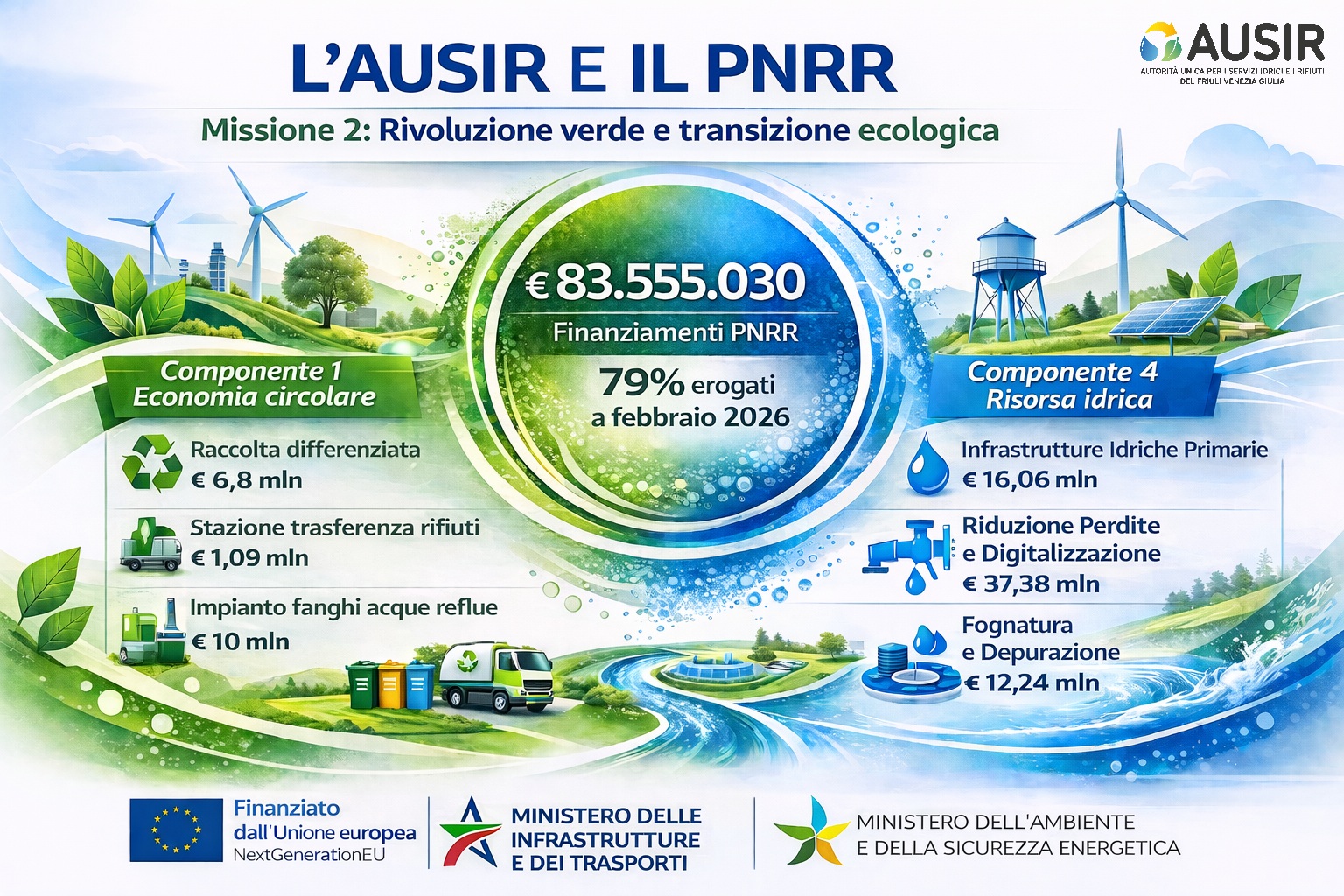 Il Piano nazionale di ripresa e resilienza (PNRR) ha destinato più di 83 milioni di euro ai servizi dell’acqua e dei rifiuti in FVG. Di questa somma, oltre 65 milioni sono già stati distribuiti, pari al 79% dei fondi disponibili.
