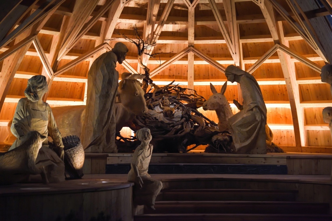 Di giorno, decine di presepi artigianali e artistici – per lo più in legno, ma anche in materiali diversi – punteggiano cortili, piazzette e davanzali. Sono opera di maestri e appassionati, ma anche dei residenti, che espongono piccoli mondi di fede e poesia all’esterno delle loro case. Cuore pulsante di “Borghi e Presepi” è La Via del Natale, cheinvita a seguire il filo di questi allestimenti, sostando nelle botteghe artigiane dove la manualità diventa racconto, degustando dolci e calde bevande natalizie, visitando luoghi speciali, come La Casa degli orsetti e il Cason dei Boscadôrs: un percorso in oltre 20 tappe per entrare nel pieno dell’atmosfera natalizia e visitare Sutrio Paese Presepe, ideale per le famiglie (orari Via del Natale: dalle 11.00 alle 19.00; 25 dicembre e 1° gennaio dalle 14.00 alle 19.00). In ogni tappa uno sticker da collezionare e attaccare alla mappa che si può ritirare all’infopoint nella piazzetta di fronte al Salotto Paese, vicino al Municipio: per chi completa tutti i punti c’è un regalo speciale per ricordare il Natale a Sutrio. Punto di partenza ideale è il Presepe che ha campeggiato in Piazza San Pietro nel 2022: oggi risplende nella piazzetta sotto il Municipio, con una ventina di statue a grandezza naturale scolpite nel cedro, disposte su 116 metri quadrati, illuminate da 50 punti luce. La grotta, anch’essa in legno, è una cupola alta 5,65 metri (per 41 mq), un abbraccio scenografico che si accende di sera. Per realizzarla, nessun albero è stato abbattuto: un gesto coerente con la montagna che accoglie senza ferire.