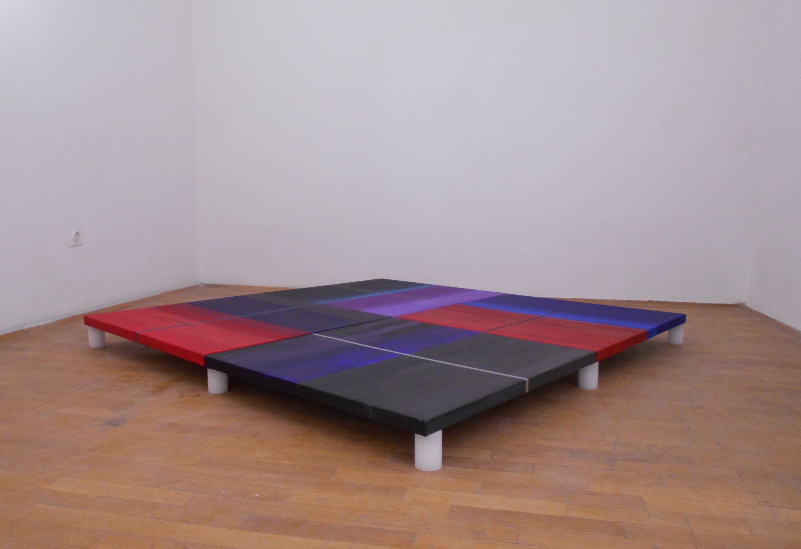 La prima nota di evidente intreccio di storie tra i cicli pittorici qui esposti è la sottrazione che si sviluppa nel processo costruttivo di ogni singolo dipinto – una sottrazione che non nega la complessità, ma che vi aderisce nella somma di segni minimali e nella costante del numero tre – tre i colori impiegati in ogni opera, tre le campiture nelle quali detti colori si affermano. La seconda è la pacatezza di queste geometrie, le cui stesure sono tutte dipinte ad acrilico; la terza è la luce come punto di riferimento primario, e non solo relativa a una fonte luministica esterna, ma soprattutto a una luce intrinsecamente interiore o simbolicamente generata dall’opera; la quarta nota è la dominante cromatica che si manifesta in contrasti forti e decisi infine la quinta nota è l’evocazione indiretta o fatta scaturire dall’interno della campitura. I punti di riferimento, o modelli culturali, vanno rintracciati nel silenzio della pittura di Edward Hopper e nelle sequenze cromatiche di Mark Rothko: ambedue questi autori ci riferiscono di una solitudine esistenziale e di una sconfitta dell’illusione realista.